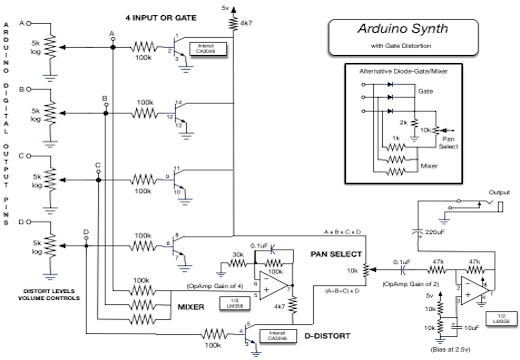 Includes a unique analog Fuzz box circuit on one of the voices that uses an Arduino output to enhance the distortion.