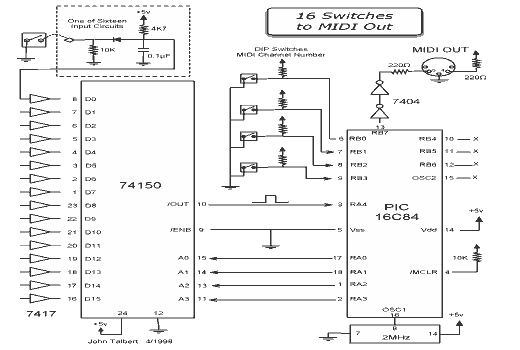 This circuitry employs a PIC single chip microcomputer. The software watches for changes on the 16 inputs and sends out Midi signals when it sees a change. Timing for the Midi output signal is built by carefully counting PIC instruction cycle times.